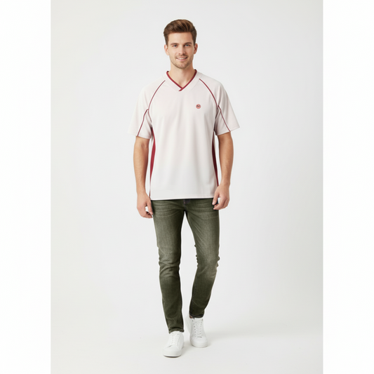 Kitchen Performance Pickleball V-Neck Stitch Tee Shirt –- White & Red